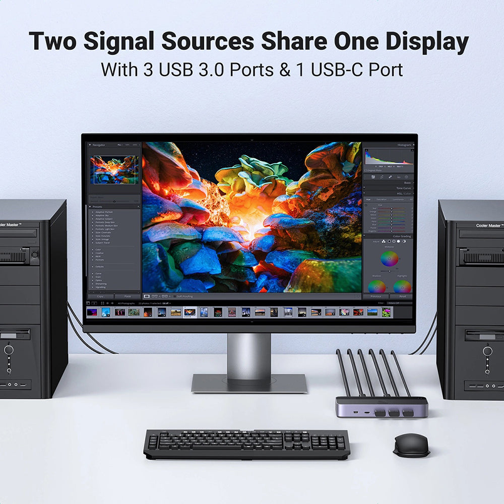 Increase your efficiency and optimize your workspace with UGREEN CM664, a multifunctional KVM video switch that allows you to control two computers simultaneously