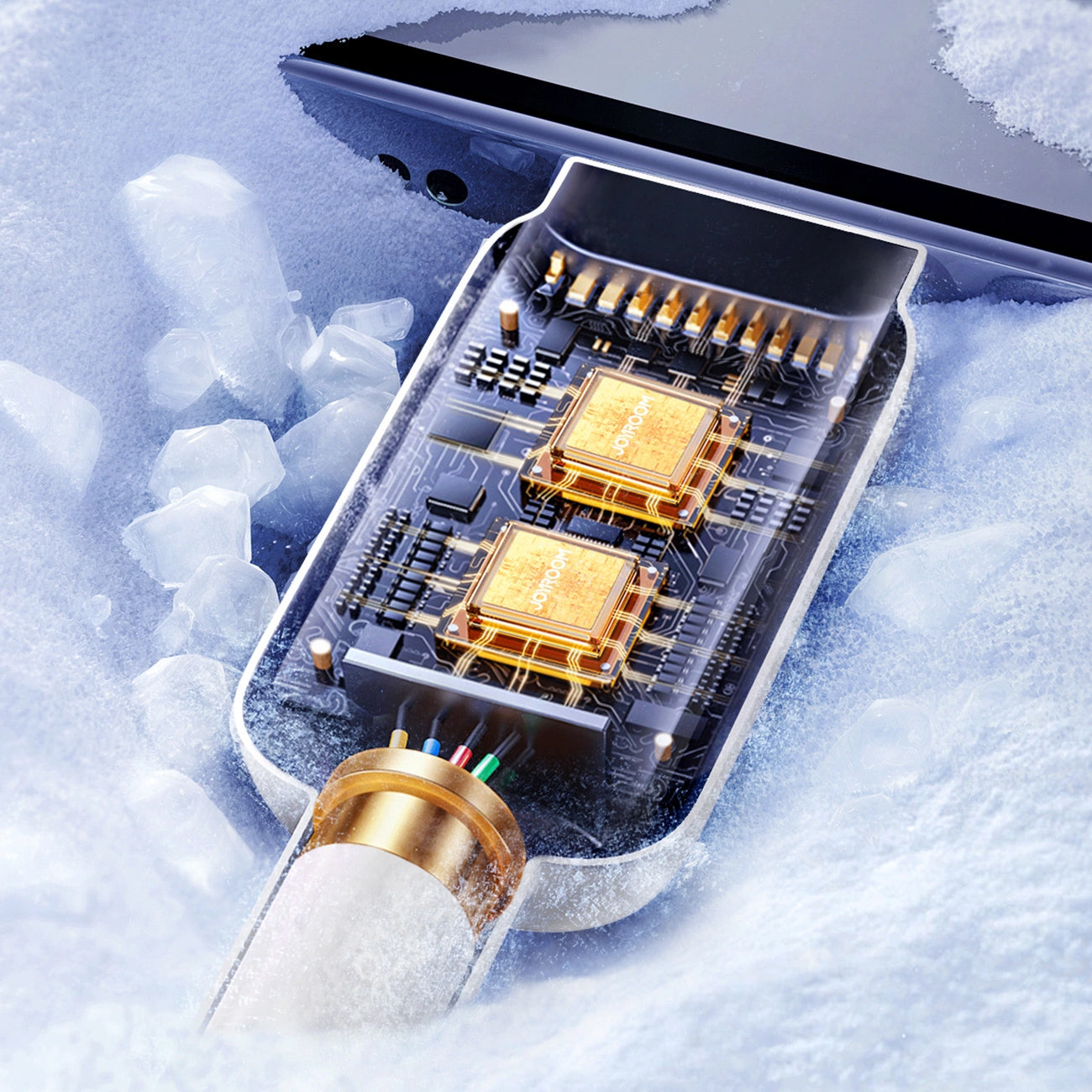 El refuerzo en la zona del conector previene daños, mientras que la superficie con textura aterciopelada ofrece un aspecto elegante y un agarre cómodo.