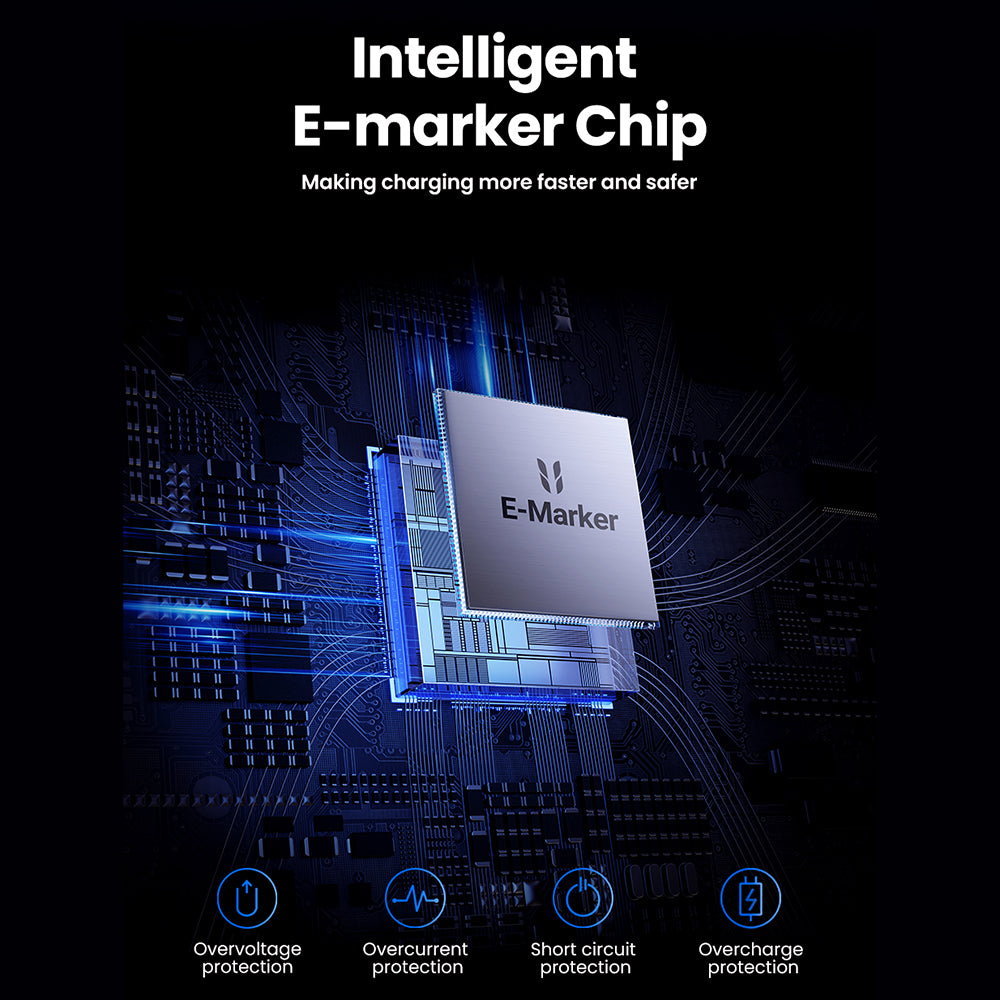 - Seguridad: chip E-marker para regulación automática tensión/corriente, protección contra sobrecorriente/sobrecalentamiento/cortocircuito