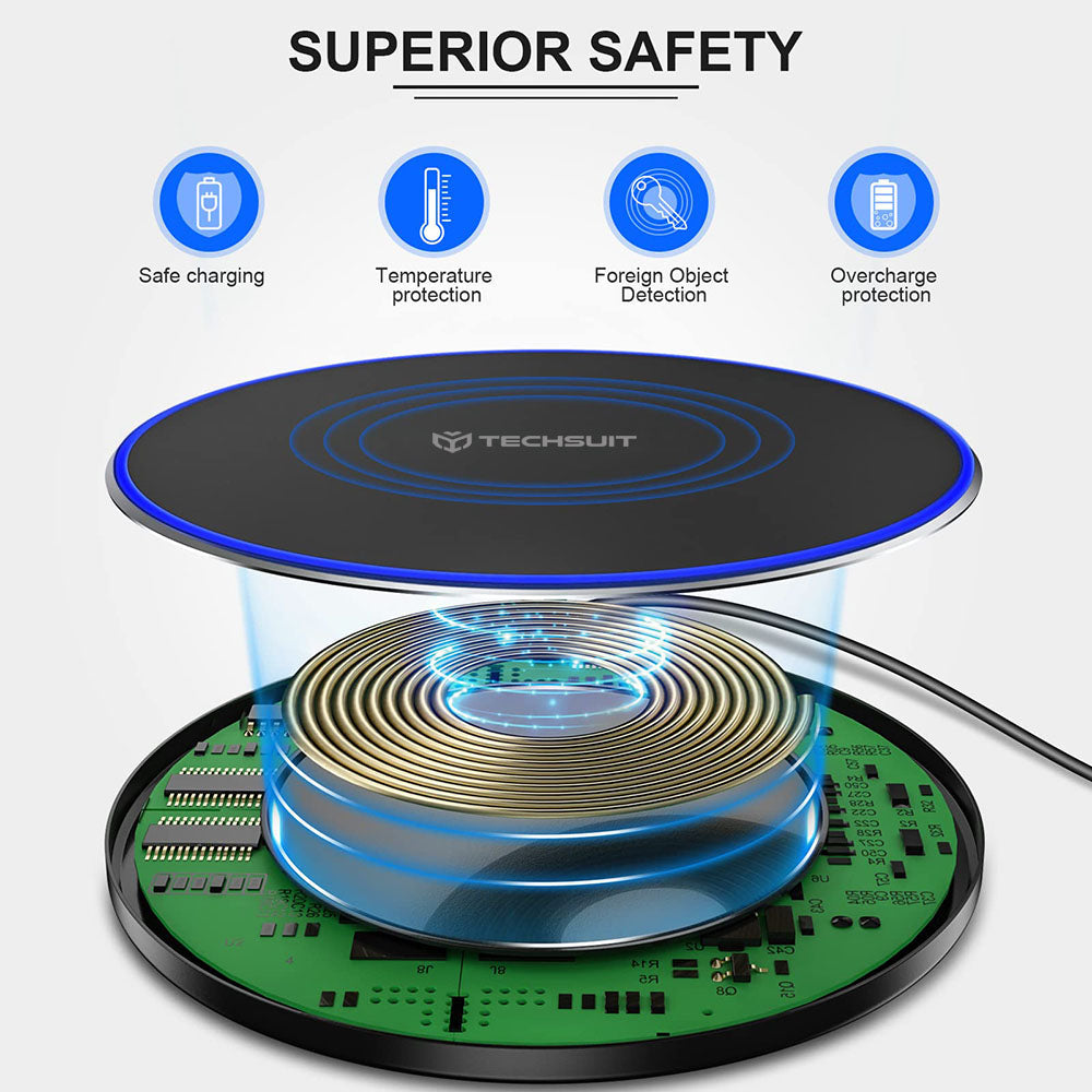 Lo has encontrado, el adecuado para ti. El cargador inalámbrico de Techsuit carga rápidamente tus dispositivos. Disfruta de todas las ventajas ofrecidas. El cargador inalámbrico Qi está a solo un clic de distancia.